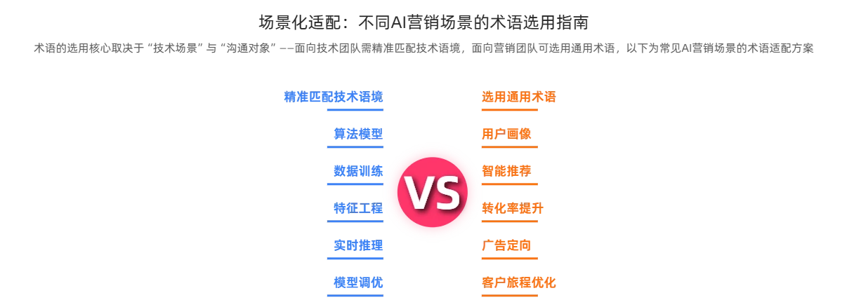 术语的选用核心取决于“技术场景”与“沟通对象”——面向技术团队需精准匹配技术语境,面向营销团队可选用通用术语,以下为常见AI营销场景的术语适配方案: