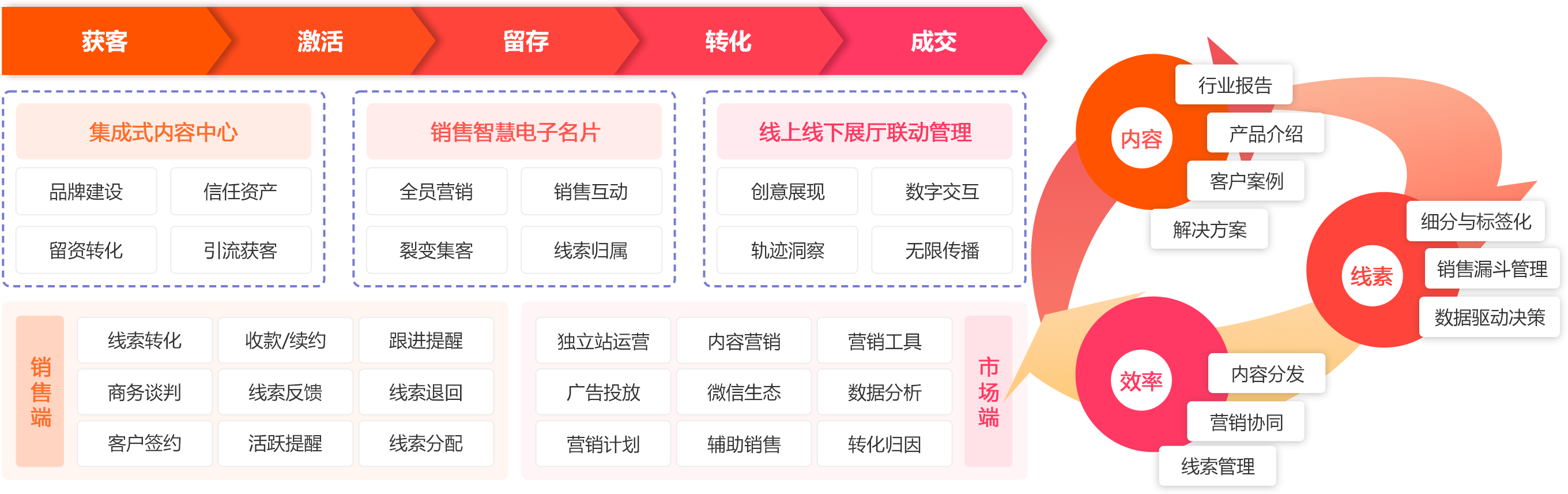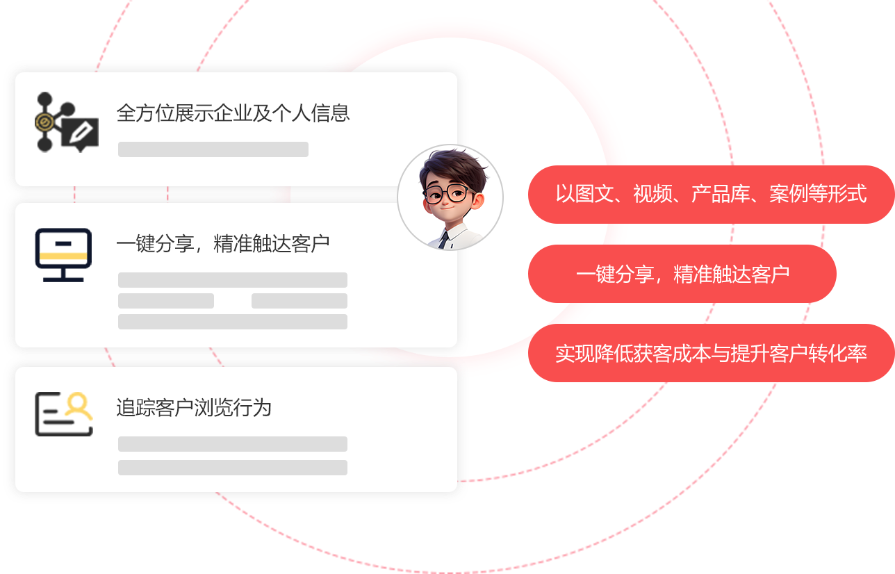 以图文、视频、产品库、案例等形式全方位展示企业及个人信息,从被动分发变为主动营销;
