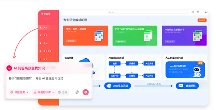 聚合文档、表格、超链接等多模态知识资源,支持PDF/Word/Excel/ 网址等格式文件云端管理。AI自动分段解析内容,支持人工标注高频 问题、补充关联问答对,实现知识颗粒度精细调优。为AI文生文、AI 客服等提供按需调用知识,从源头保障知识准确性。