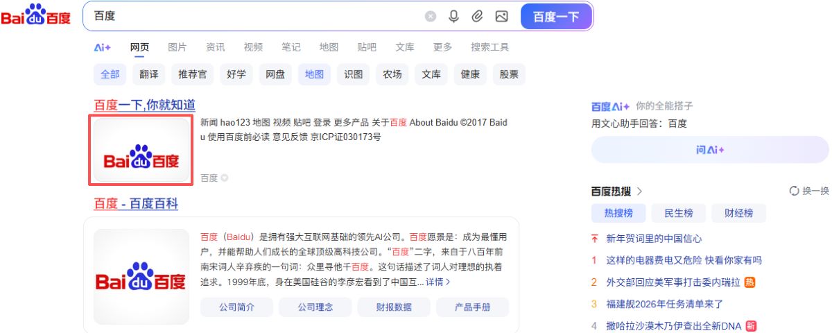 站点Logo是百度搜索中代表网站品牌的视觉标识,具体表现为当用户搜索网站名称时,显示在搜索结果页中网站标题下方的Logo图案。它不仅有助于用户在众多结果中快速识别目标网站,还能有效提升站点的专业形象与视觉吸引力,从而增强曝光度,吸引更多搜索用户点击访问。其展示样式通常为清晰、辨识度高的图片,位于标题与摘要之间,形成视觉焦点,帮助网站从搜索结果中脱颖而出。