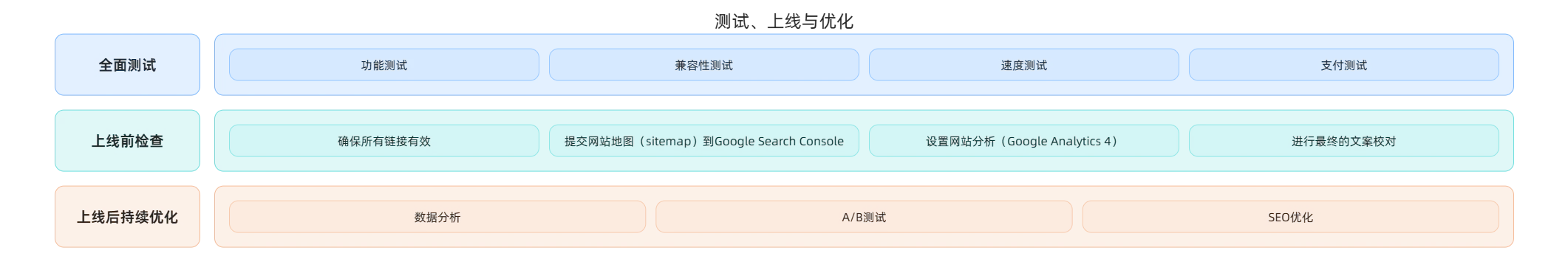 网站搭建完成后,需经过全面测试才能上线,上线后还需基于数据持续优化,提升转化效果。
