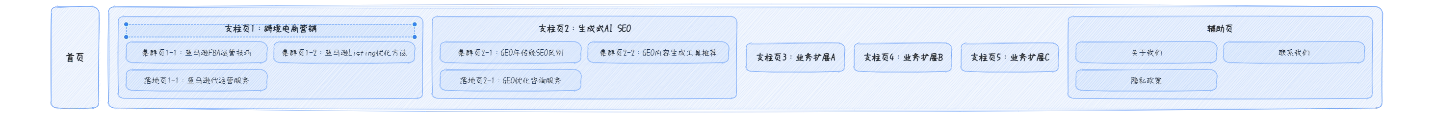核心逻辑:首页为顶层枢纽,支柱页承接核心主题,集群页/落地页下沉细分需求,所有页面3次点击可达。