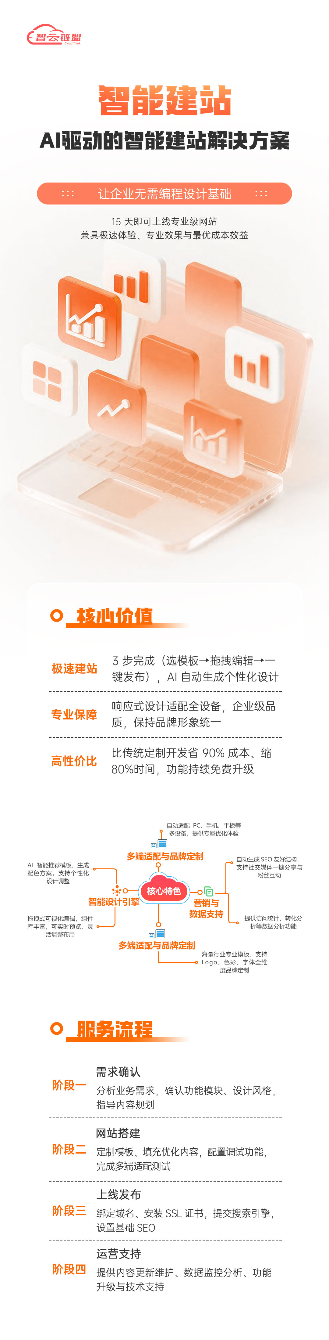 告别昂贵的设计费和冗长的开发周期。我们的智能建站平台,通过AI与拖拽式操作,让您在几天内就能拥有一个功能全面、美观且能自适应所有设备的专业网站。